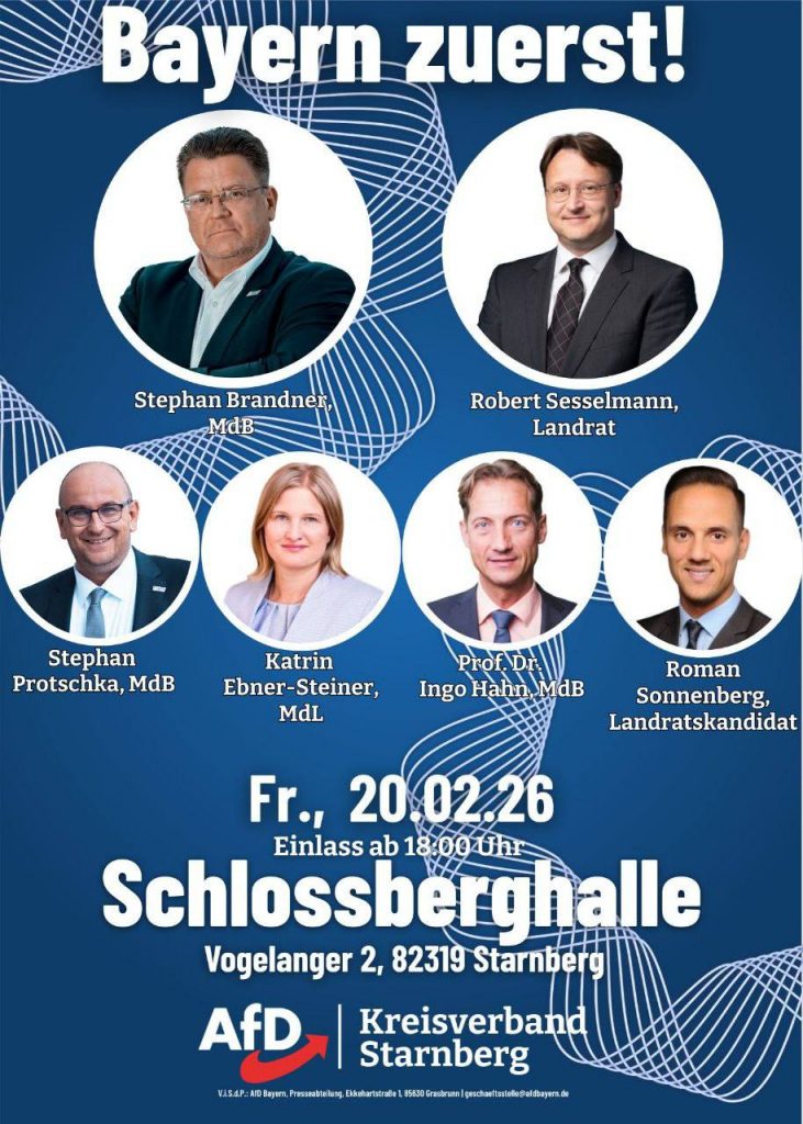 Hierzu werden zwei prominente Gastredner aus Thüringen erwartet: Der stellvertretende AfD-Bundesvorsitzende Stephan Brandner (MdB) und der erste AfD-Landrat Deutschlands, Robert Sesselmann aus Thüringen. Außerdem wird mit dem Landesvorsitzenden Stephan Protschka (MdB) und der Landtags-Fraktionsvorsitzenden Katrin Ebner-Steiner(MdL) die bayerische AfD-Spitze auftreten. Der Kreisvorsitzende Prof. Dr. Ingo Hahn (MdB) wird die Veranstaltung moderieren, bei der auch der Starnberger Landratskandidat Roman Sonnenberg sprechen wird.Kreisvorsitzender Prof. Dr. Ingo Hahn hierzu: