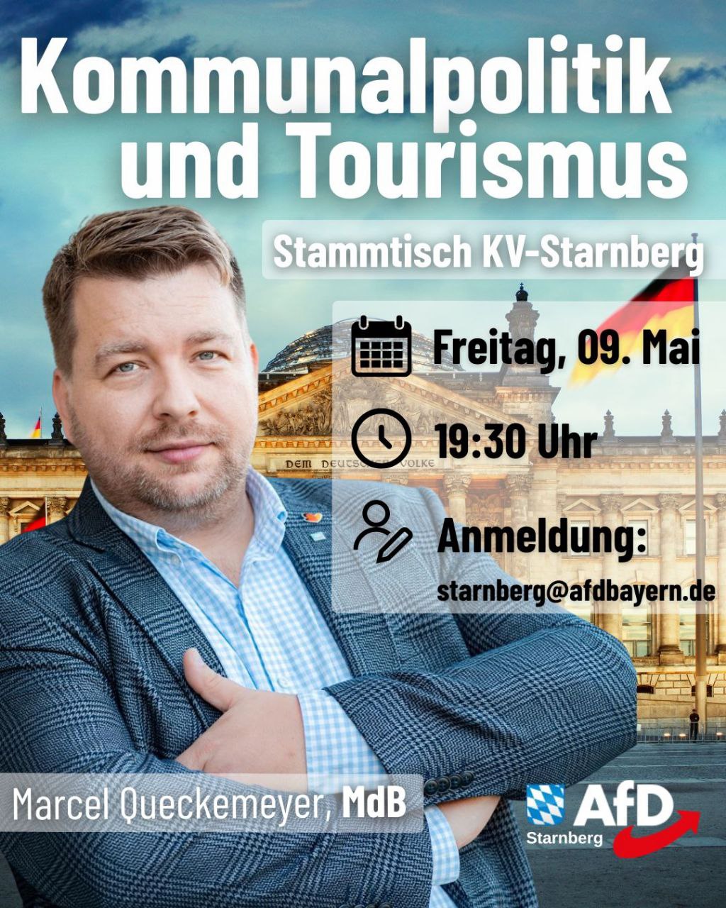 Der KV-Starnberg lädt zum Stammtisch am 09.05.25 mit Marcel Qeckemeyer, MdB ein. Anmeldung bitte unter: starnberg@afdbayern.de